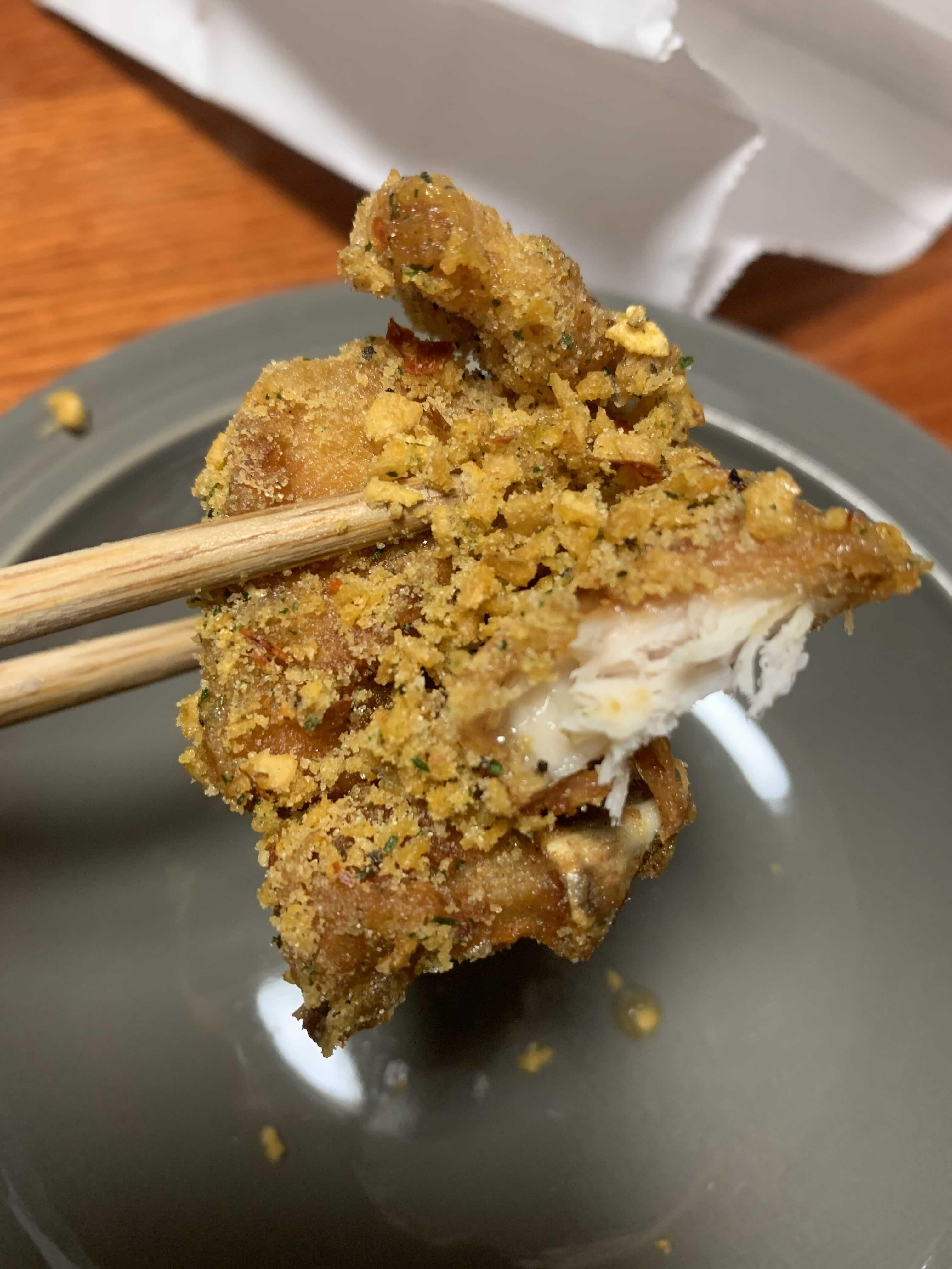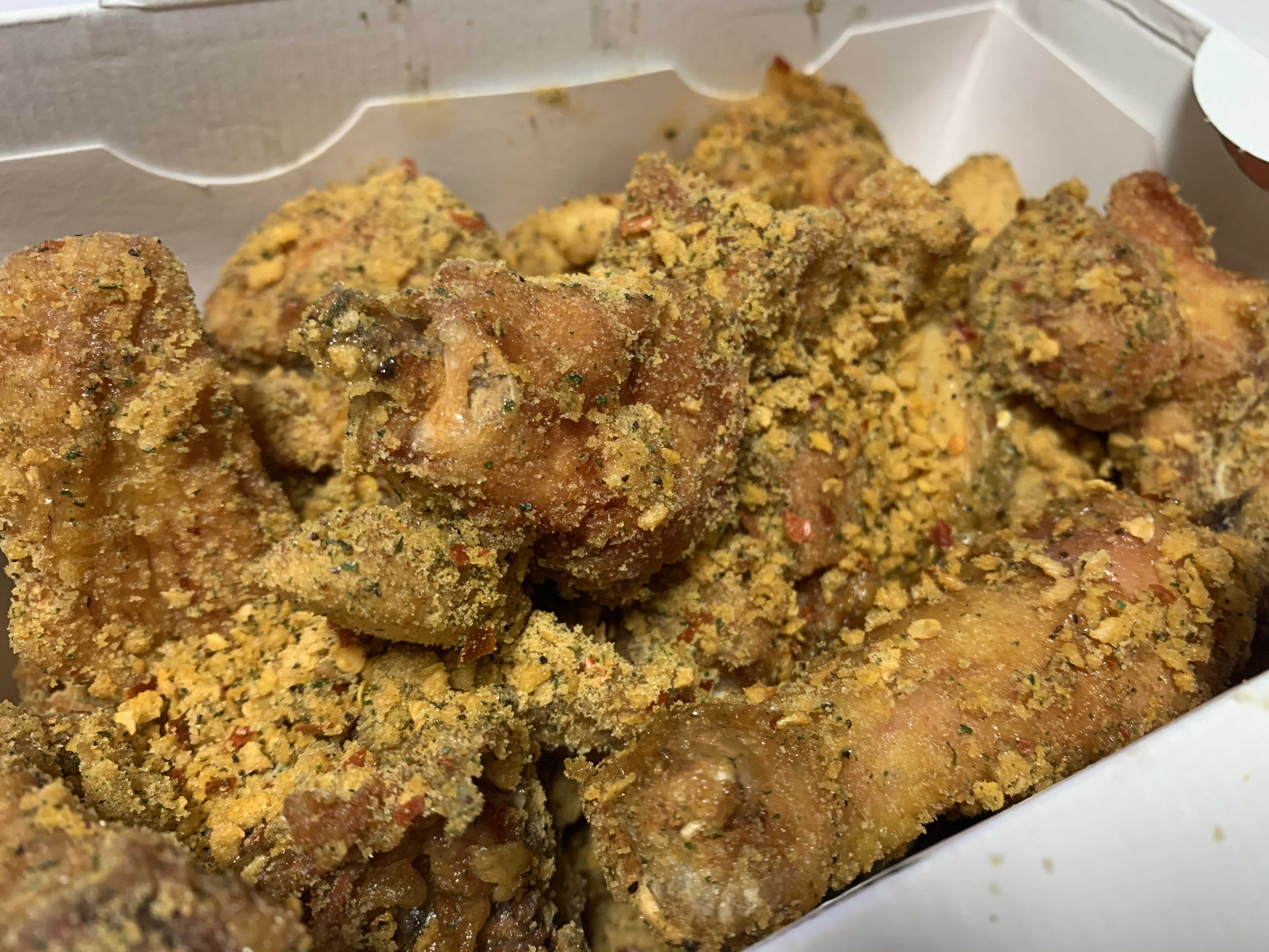 알싸하고 달큰한 마늘소스를 입힌 치킨에 시즈닝을 한 모양새인데 빨간 고추로 매콤함을 추가한듯