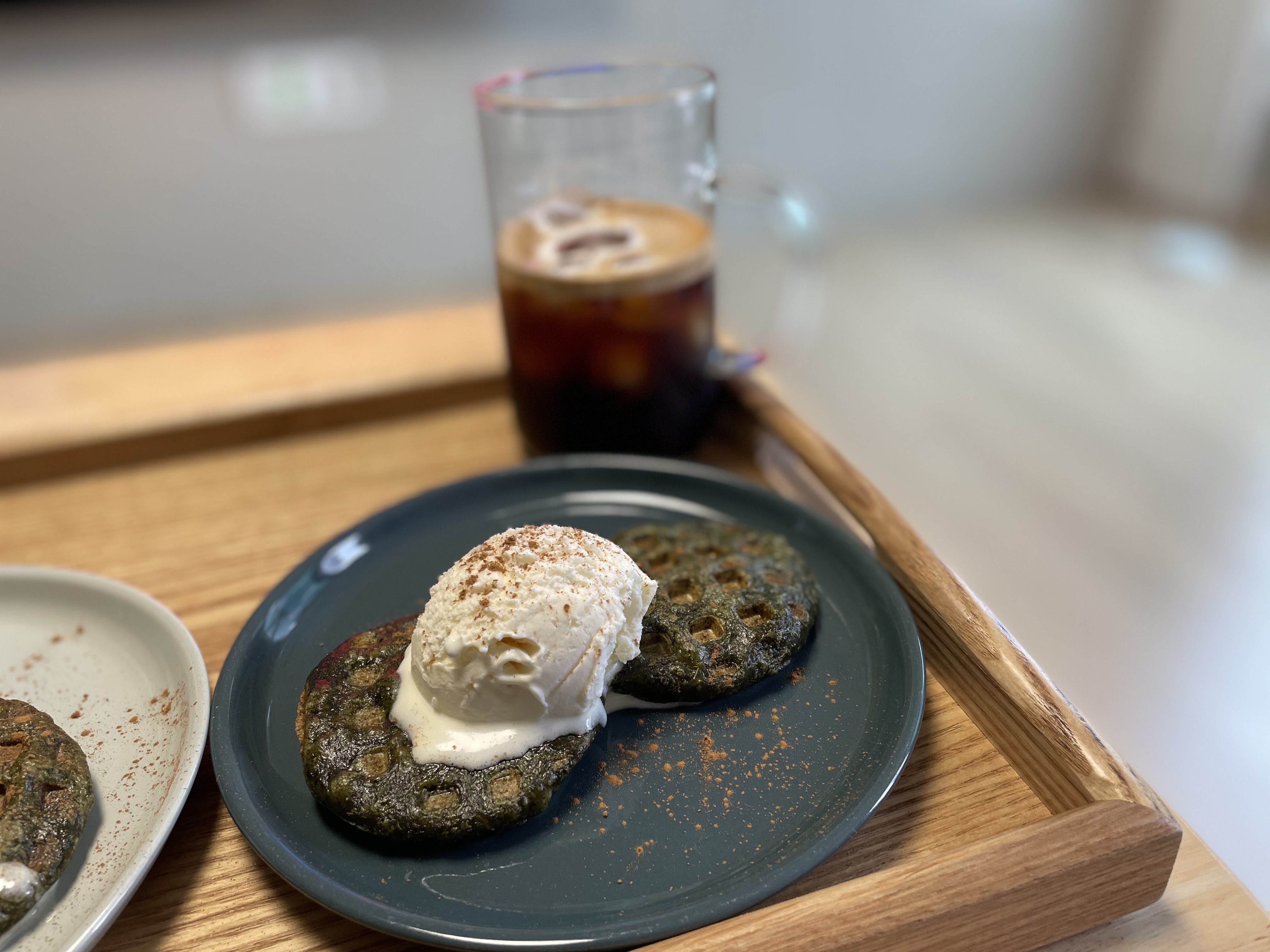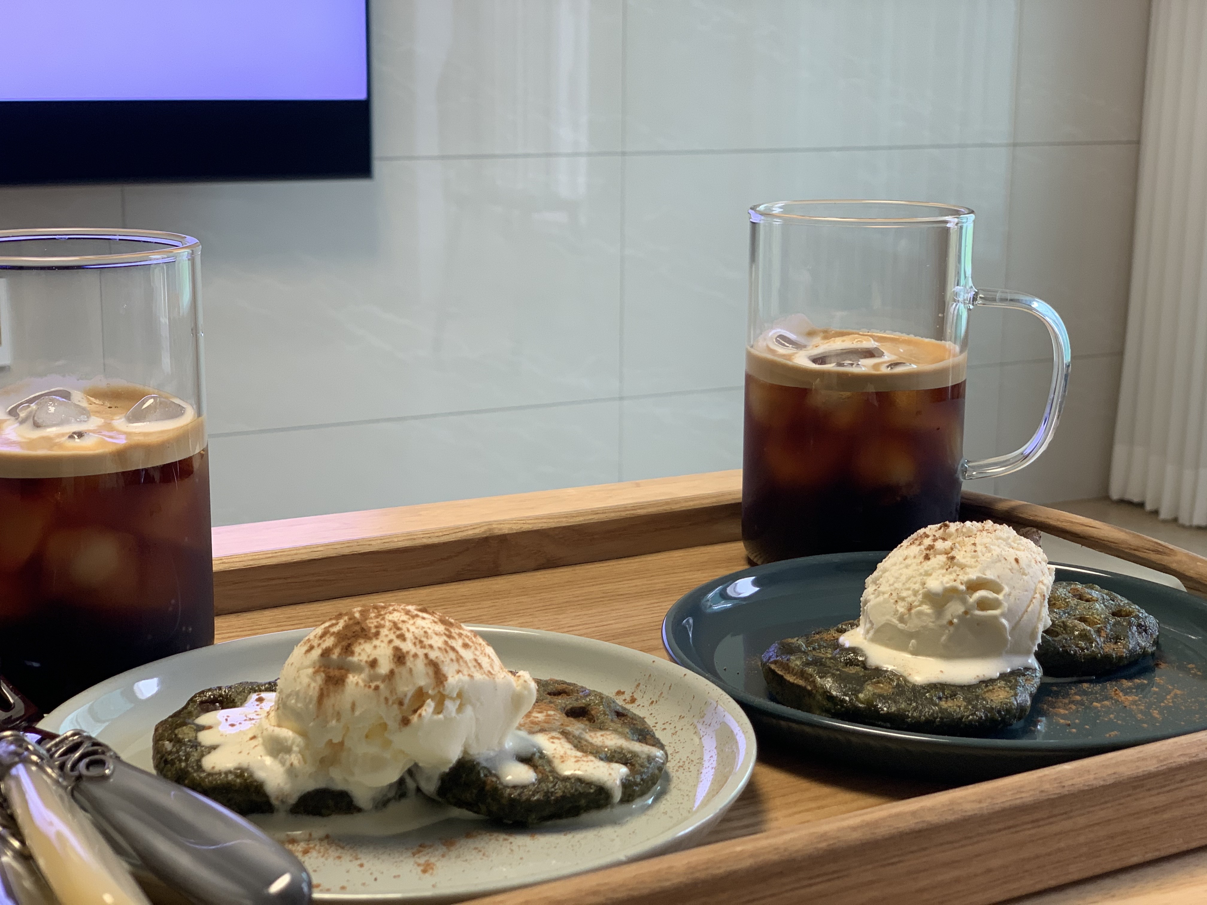 겉은 바삭하면서 쫄깃한 식감과 향긋한 쑥내음이 느껴지는 쑥떡 와플, 그 위로 올린 바닐라 아이스크림과 커피한잔!