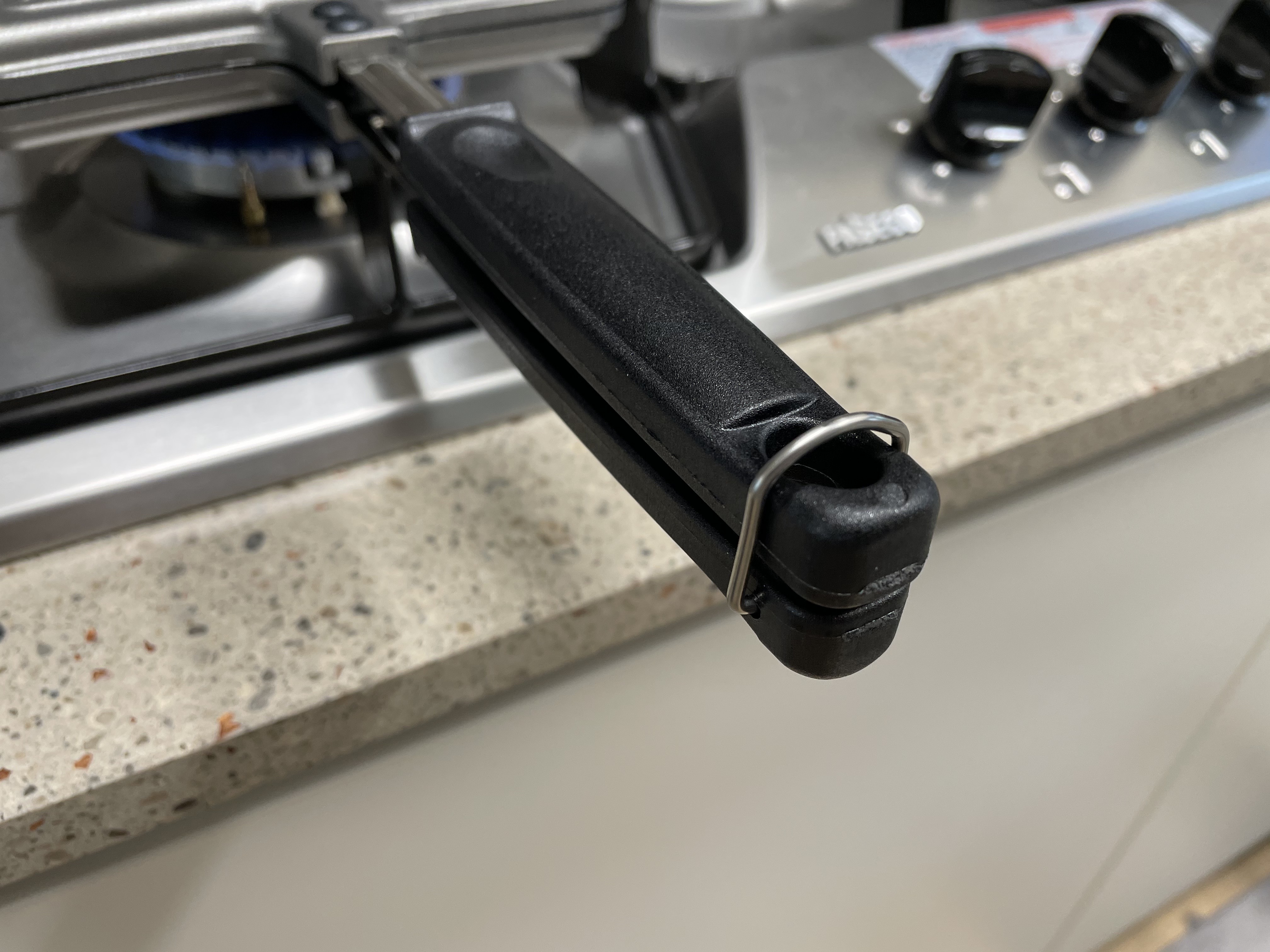 양면팬을 닫고 손잡이에 달린 걸쇠로 양 손잡이를 꾸욱 눌러주기