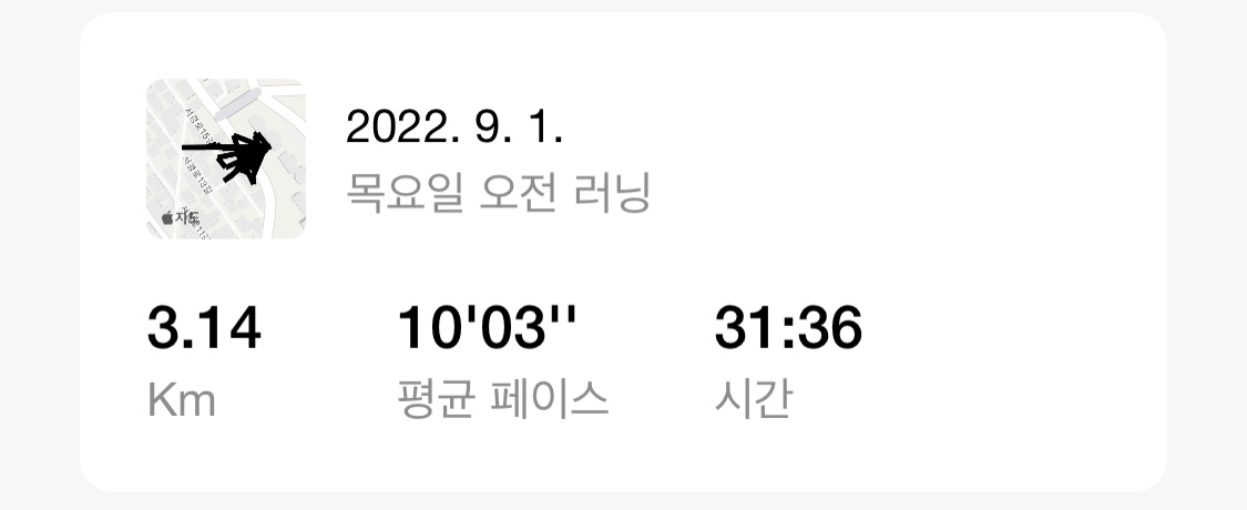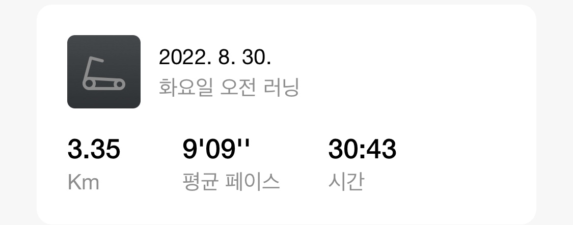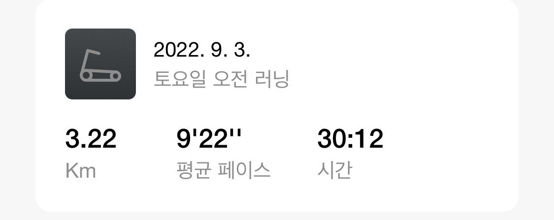 9월을 시작하는 아침 또 실외러닝을 까먹고 바꾸지 않아 기록이 실외 러닝으로 되었지만 러닝머신으로 3KM완료