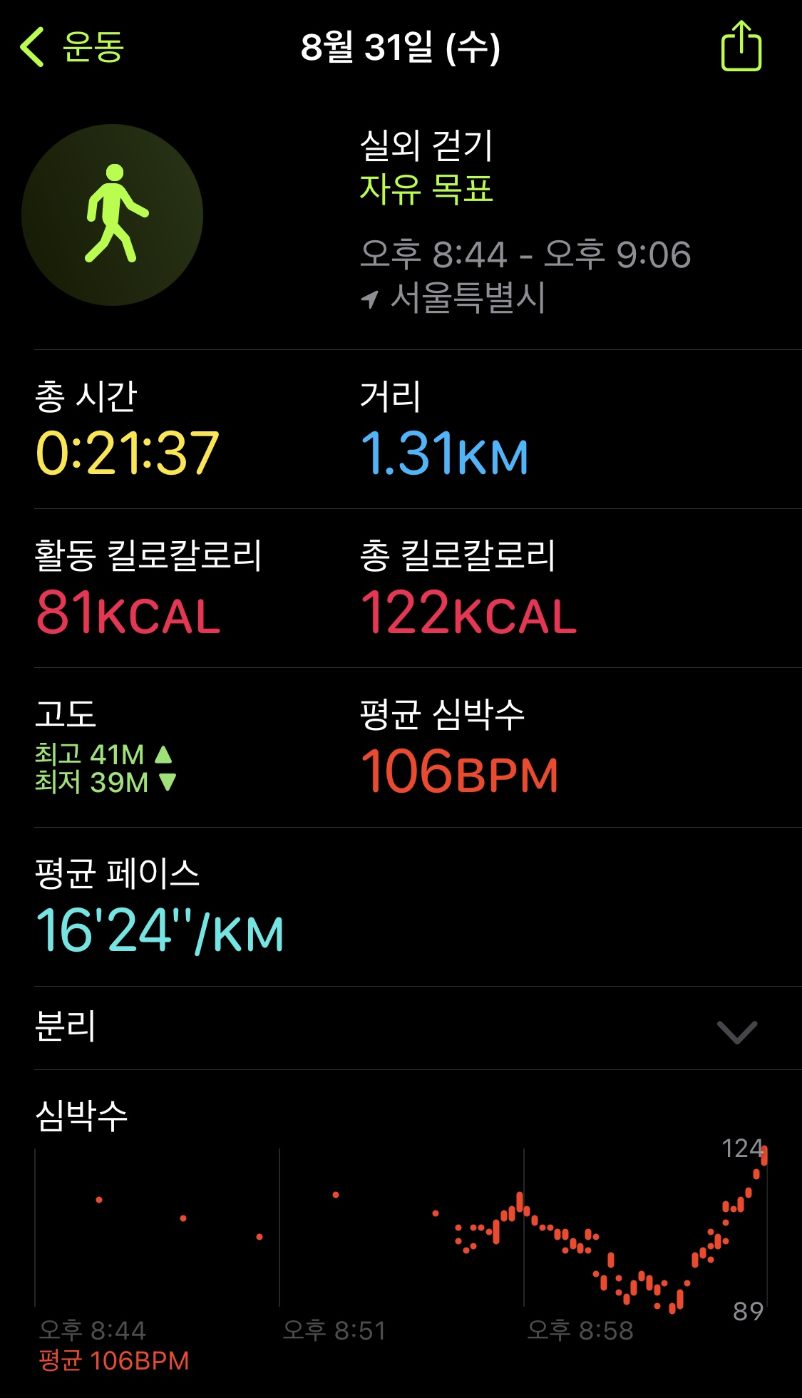 30분 평균페이스 7~9km 속도로 빠르게 뛰다 걷다를 반복하면 3KM 를 금방 채운다.