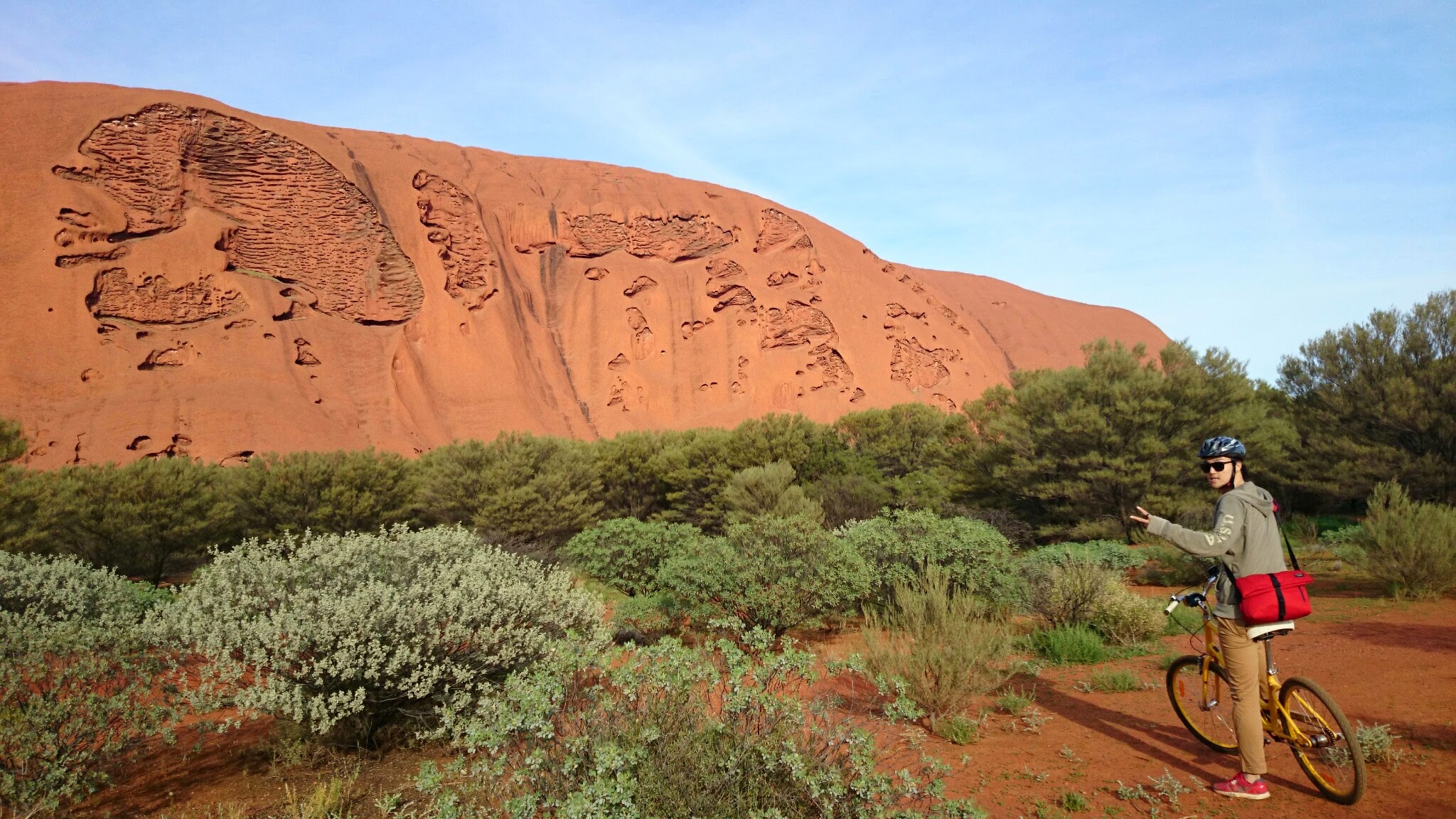 사실 나름의 여행메이트인 자전거를 타지 못하고 여행을 마치면 많이 아쉬울 것 같았다. 고맙게도 울룰루 관광코스엔 자전거가 옵션으로 있었다. 13명의 일행은 흩어졌다. 몇몇은 걸었고 몇몇은 나와 같이 자전거를 타고 달렸다. 웅장한 바위산 곳곳엔 사진을 찍지 말아달라는 표지판이 있었다. 어보리진에게 있어 바위산은 단순한 자연이 아닌 신성한 성지라는 이유에서였다. 하지만 조나단과 엘리스가 무언의 약속을 깨고 사진을 찍기 시작하면서 팀원들 전부 숨어서 사진을 찍다가 대놓고 찍기 시작했다.